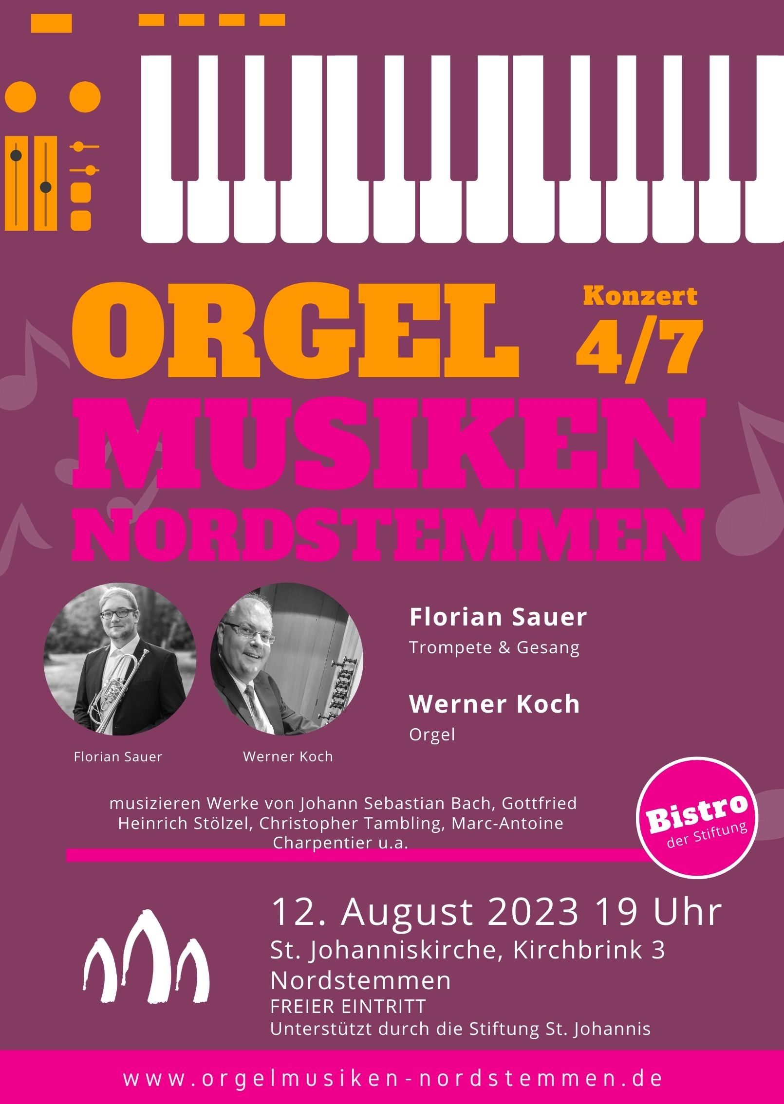 Am 12. August lädt die St.-Johannis-Kirchengemeinde Nordstemmen zum vierten Konzert im Rahmen der Sommermusiken Nordstemmen ein. Florian Sauer (Trompete und Gesang) und Werner Koch (Orgel) musieren Werke von Johann Sebastian Bach, Gottfried Heinrich Stölzel, Christopher Tambling, Marc-Antoine Charpentier und anderen.